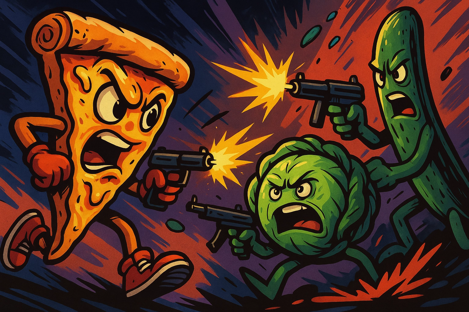 Food Fight 404 is a high-octane, wave-based shooter that turns your favorite junk-food stereotypes into unholy avengers against the tyranny of healthy produce. Step into the crust of a living pizza slice (or unlock new “junk” skins in the Kitchen) and fend off endless waves of broccoli drones, kale knights, and carrot cannons as they surge toward you on a perpetually scrolling kitchen floor.